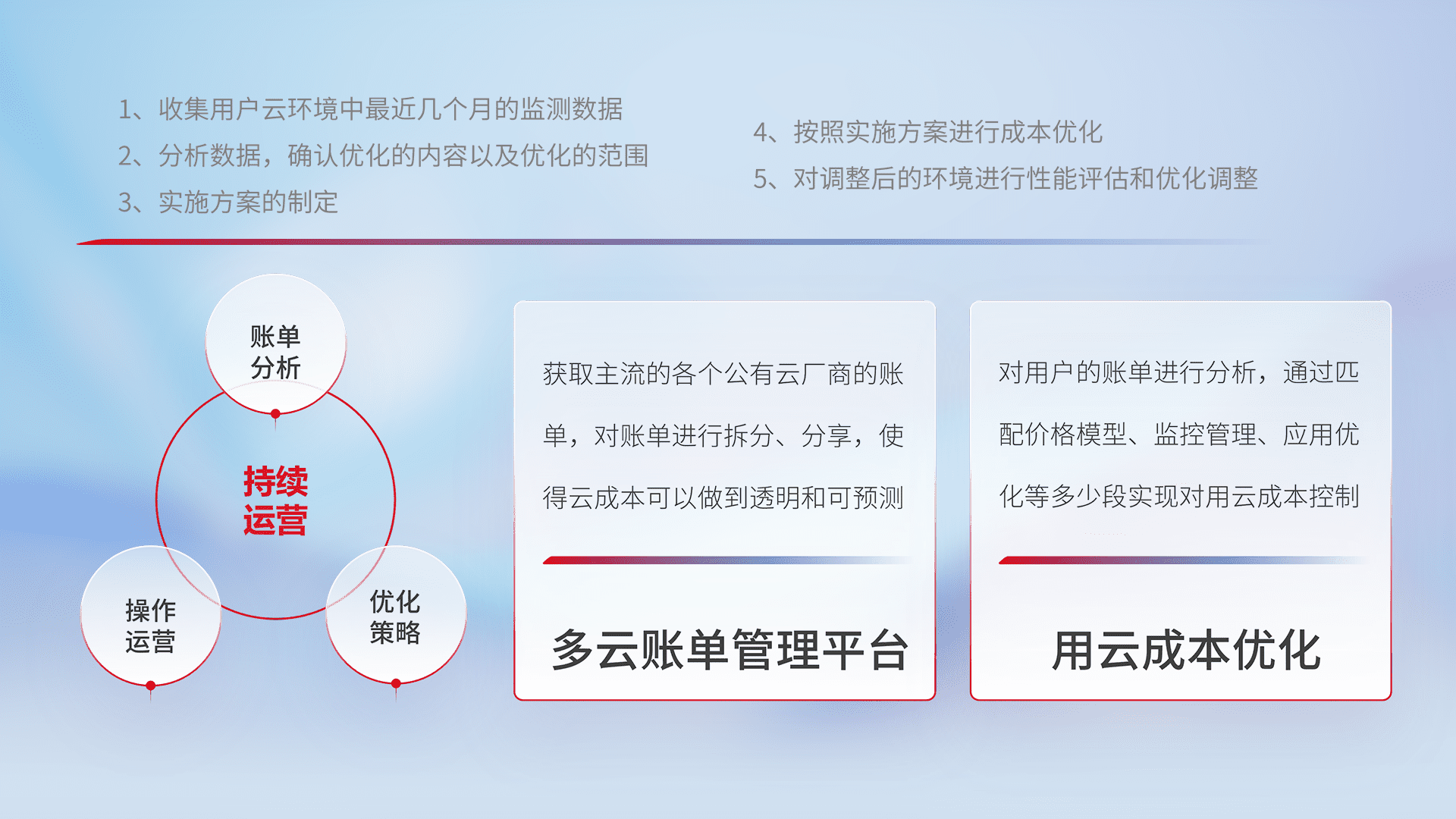通过多云纳管,,,,以统一的资源数据模型把客户的云资源进行抽象和封装,,,进而实现对多云资源的统一操作,,,,保障云资源管理的可靠性、、、、稳定性与可用性。。。。量身定制化运维内容,,,配置、、、、开发运维、、补丁管理、、、备份、、、监控、、、、认证和访问管理、、审计和日常巡检等,,,,保障在用云过程中的可靠度,,,稳定度以及高可用率。。。